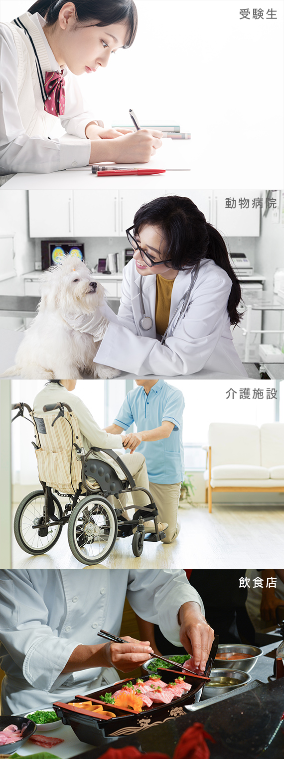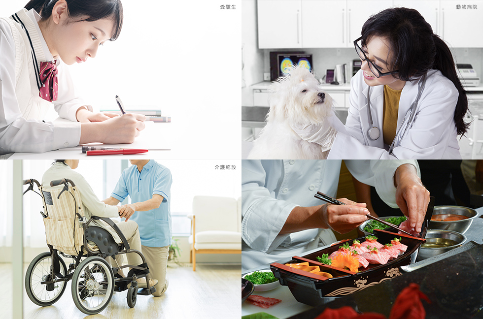 病院・動物病院・受験生・介護施設・ペット・飲食店・学習塾など幅広いシーンでご利用いただいています。